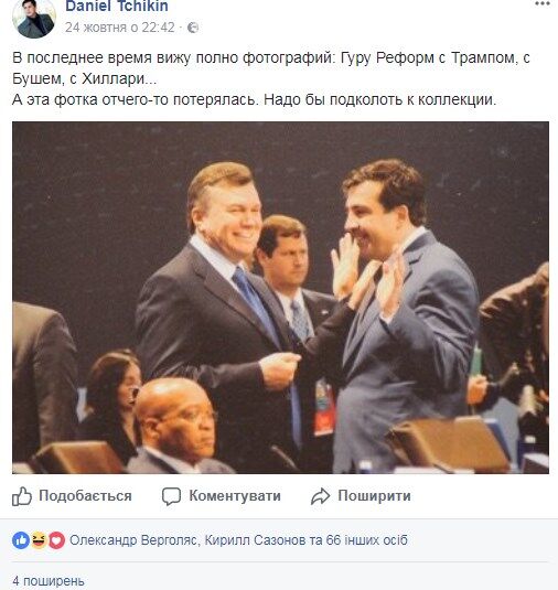 "В последнее время вижу полно фотографий: Гуру Реформ с Трампом, с Бушем, с Хиллари... А эта фотка отчего-то потерялась. Надо бы подколоть к коллекции", - подписал он фото, на котором экс-президенты прямо светятся от счастья.