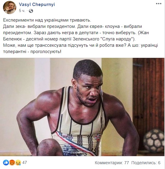 "Эксперименты над украинцами продолжаются. Дали зека - выбрали президентом. Дали еврея- клоуна - выбрали президентом. Сейчас дают негра в депутаты - точно выберут (Жан Беленюк - десятый номер партии Зеленского Слуга народа). Может, нам еще транссексуала подсунут ли работа уже? А что: украинцы толерантны - проголосуют!", - написал он.
