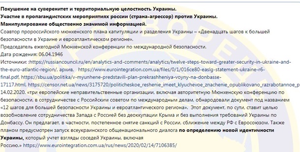 "Он предлагает, в частности, постепенное снятие санкций с России, сближение между РФ с Евросоюзом. Также планом предусмотрен запуск всеукраинского общенационального диалога по определению новой идентичности Украины, который учтет взгляды соседей Украины, включая Россию", - говорится на сайте Миротворца.