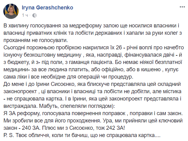 Р. S. Твое лицо, когда ты видишь, что не сработала карточка..." – пишет первый вице-спикер Верховной Рады Ирина Геращенко (БПП).