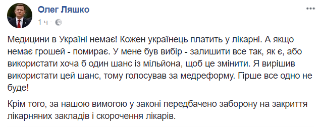 "Медицины в Украине нет! Каждый украинец платит в больнице. А если нет денег - умирает. У меня был выбор - оставить все, как есть, или использовать хотя бы один шанс из миллиона, чтобы это изменить. Я решил использовать этот шанс, потому голосовал за медреформу. Хуже все равно не будет! Кроме того, по нашим требованиям в законе предусмотрен запрет на закрытие больничных учреждений и сокращение врачей", - отмтеил лидер Радикальной партии Олег Ляшко.