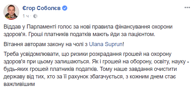 "Отдал в парламенте голос за новые правила финансирования здравоохранения. Деньги налогоплательщиков должны идти за пациентом. Поздравления авторам закона во главе с Ульяной Супрун! Надо понимать, что риски хищения денег на здравоохранение при этом остаются. Как и денег на оборону, образование, науку - любых денег налогоплательщиков. Поэтому наша задача очистить государство от тех, кто за его счет обогащается, с каждым днем становится важнее", - написал нардеп от "Самопомочі" Егор Соболев.