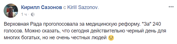 "Верховная Рада проголосовала за медицинскую реформу. "За" 240 голосов. Можно сказать, что сегодня действительно черный день для многих богатых, но не очень честных людей", - пишет блогер Кирилл Сазонов.