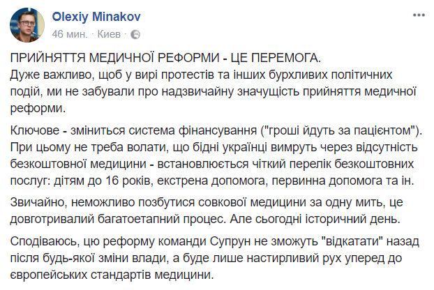 Надеюсь, эту реформу команды Супрун не смогут "откатать" назад после любой смены власти, а лишь назойливый движение вперед к европейским стандартам медицины", - пишет журналист Алексей Минаков.