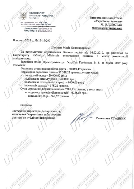 Сумма средств, начисленная Гройсману в январе, составила 37,378 тысяч гривен, из них должностной оклад - 20 тысяч, надбавка за выслугу лет - 7,8 тысяч, надбавка за интенсивность труда - 9 тысяч, индексация - 578 гривен. Сумма удержанных налогов составила 7,289 тысяч.