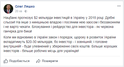 Когда мы восстановим в Украине закон и порядок, ежегодно в развитие Украины вложат $20-30 миллиардов, потому что инвестор - и внешний, и главное внутренний! - будет уверен в сохранности своих средст", - убежден лидер "радикалов".