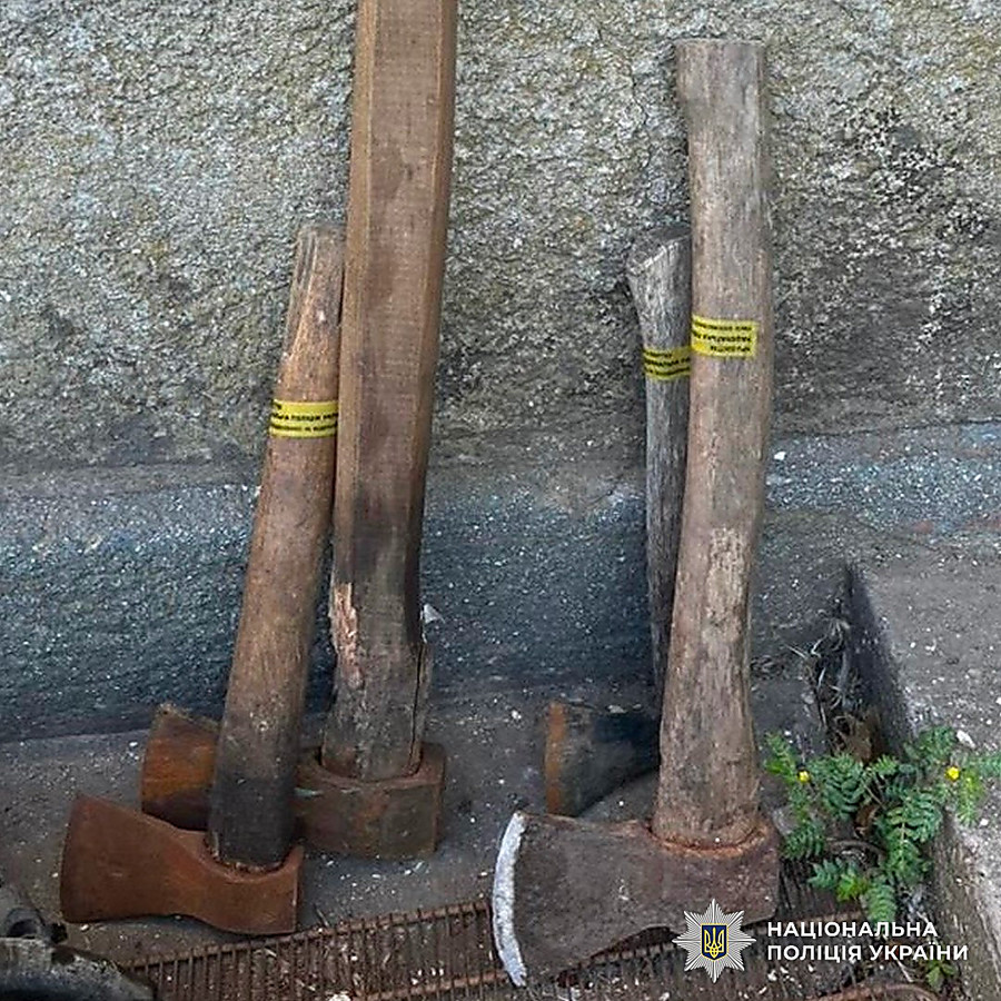 Під час обшуків за місцем мешкання фігурантів та у місцях зберігання лісоматеріалів поліція вилучила обладнання для незаконного вирубки деревини (сокири, бензиполи і ланцюги до них), мобільні телефони, банківські картки, чорнові записи та транспортні засоби.