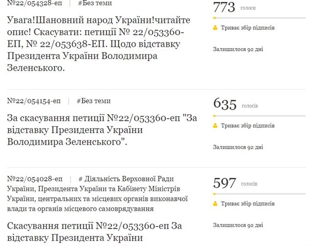 На сайте президента зарегистрировано более 10 петиций против прошения об отставке Владимира Зеленского, которое за сутки набрало почти 35 тысяч голосов.