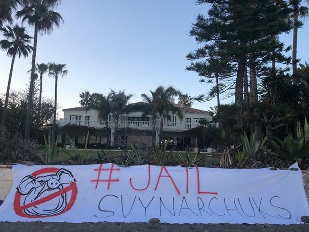 Активисты провели акцию якобы у дома президента, общая площадь которого, по их информации, составляет почти 1254 квадратных метра. В частности, на заборе усадьбы они разместили плакаты с надписями "Грабят" и "Будь ответственным. Держи слово". Также представители Нацкорпуса нарисовали на асфальте напротив имения изображение свиньи и оставили надпись "Мародер".