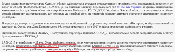 В обнародованном определении суда прямо указано, что возгорание началось 15 сентября приблизительно в 23:00. После этого работники Виктории пытались самостоятельно потушить огонь своими силами. И только около 23:30 работники сообщили службе 101 о пожаре на территории лагеря. Было потеряно драгоценное время, которое позволило бы спасти всех детей.