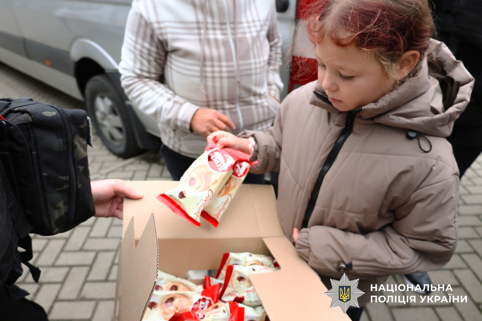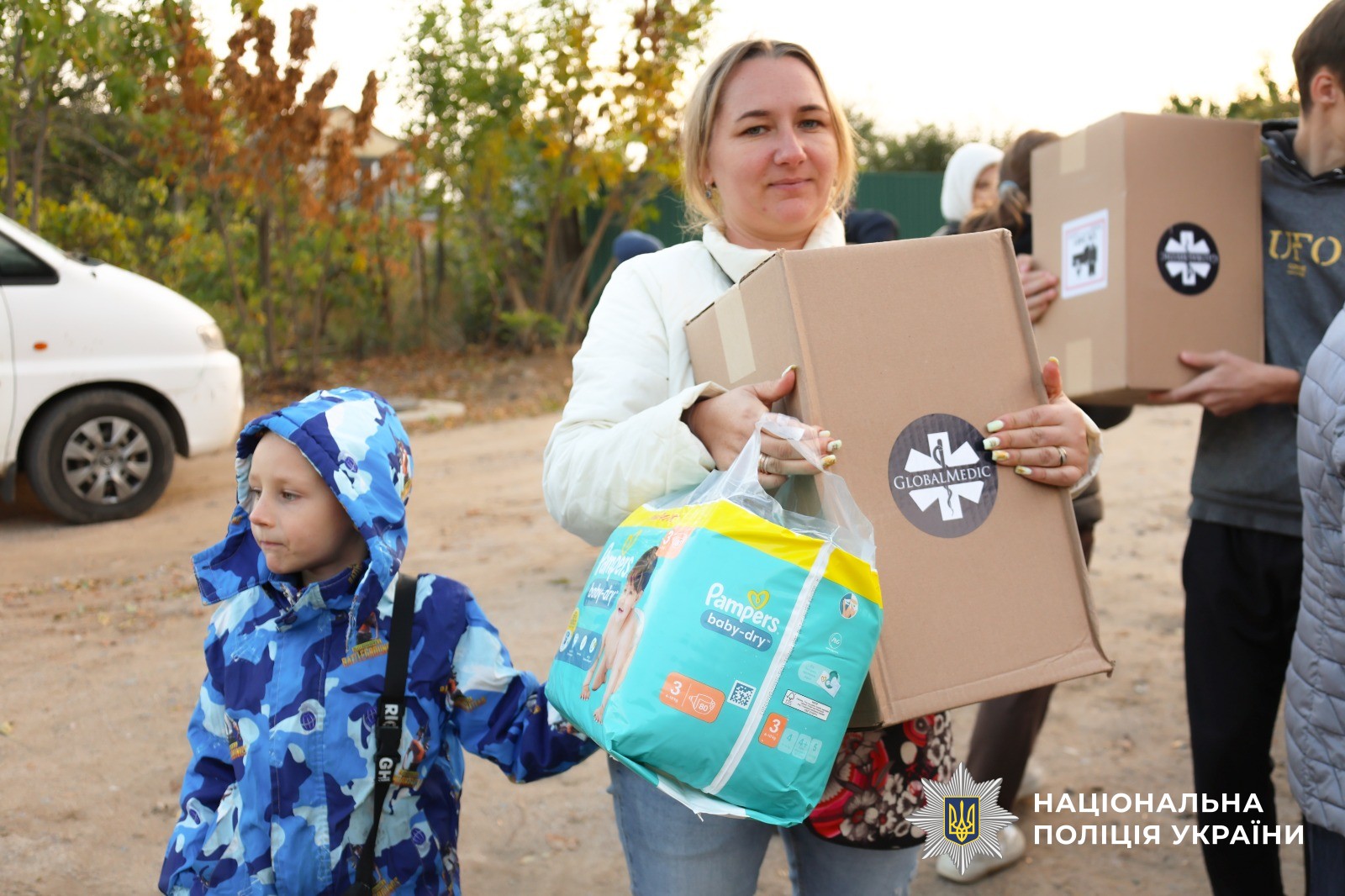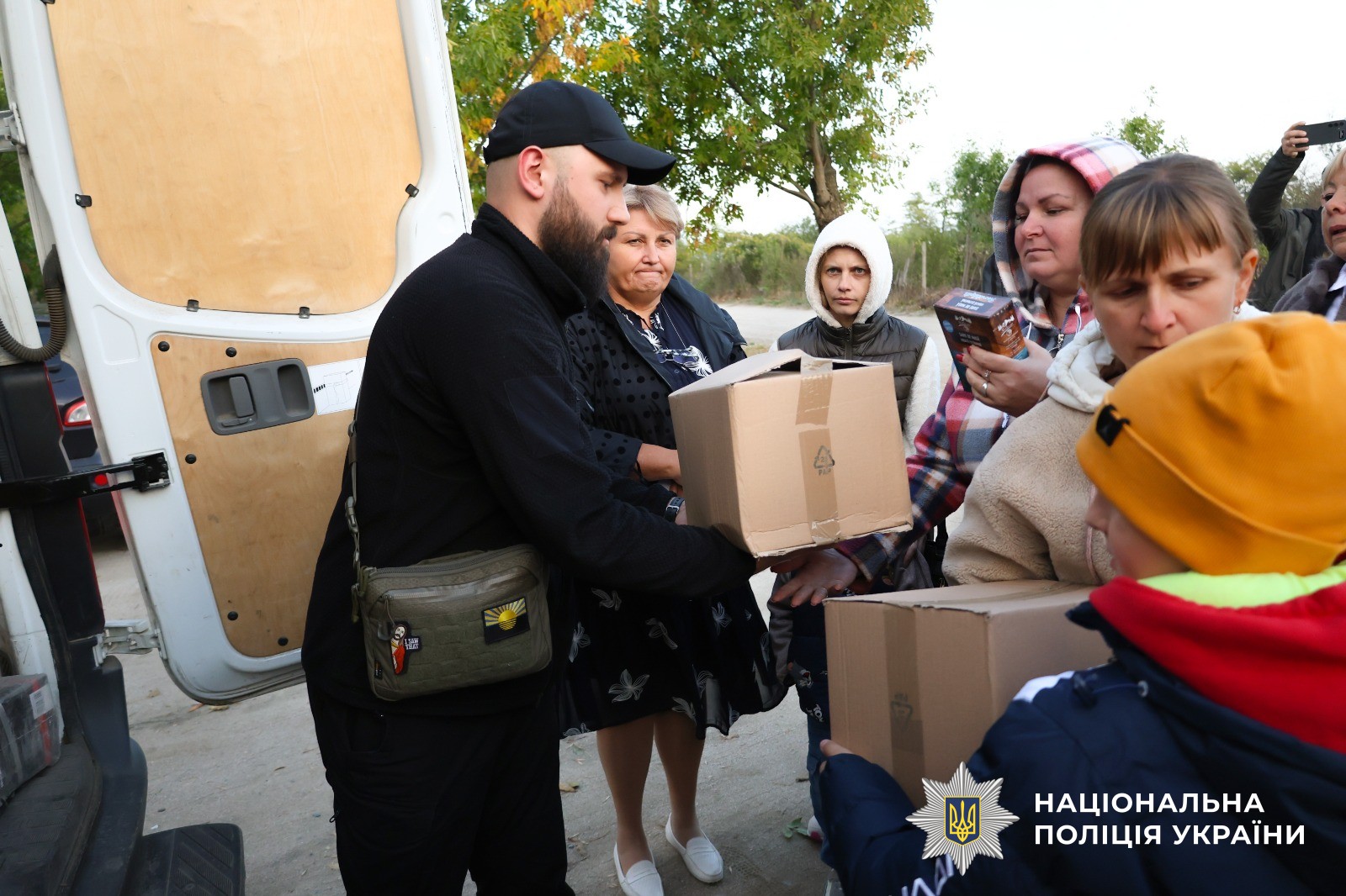 Багатодітним сім’ям і тим, хто опинився у скрутному становищі, поліцейські разом із благодійниками привезли продуктові набори, засоби гігієни, фільтри для очищення води, ліхтарики та необхідні побутові речі.