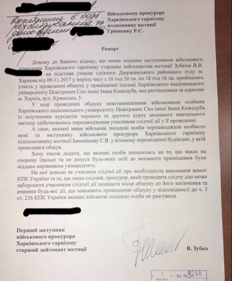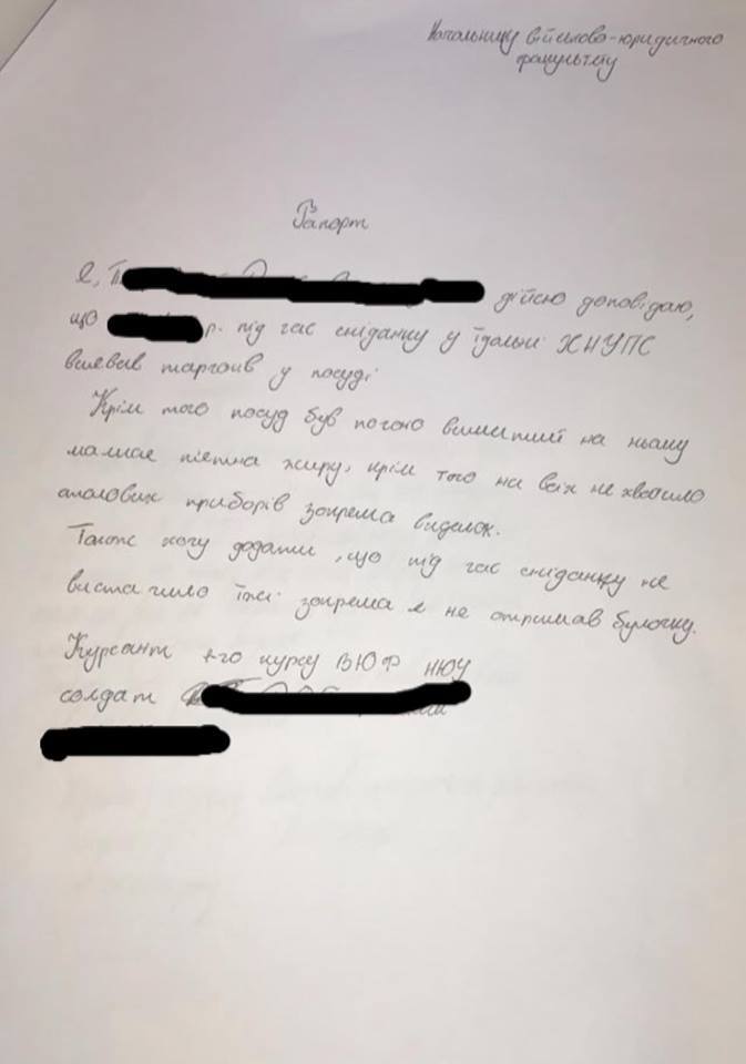 "Харьковского гарнизона, в связи с расследованием хищений в Харьковском Национальном институте Воздушных сил, шли не на склады боеприпасов, а в курсантскую столовую! Оказывается, что так питаются будущие военные летчики. С этим невозможно мириться ", - написал Матиос.