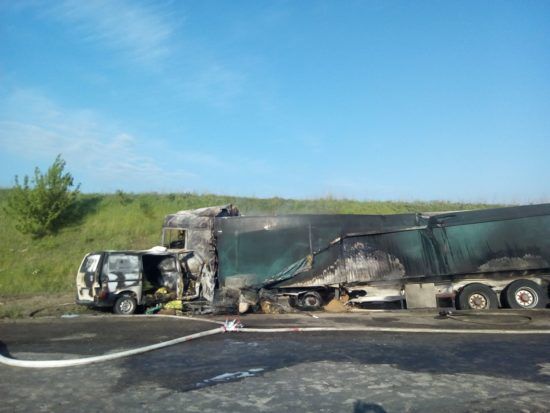 На трассе Ривне – Староконстантинов - Городище утром, 15 мая, лоб в лоб столкнулись микроавтобус и грузовик с песком. После удара оба транспортных средства загорелись.