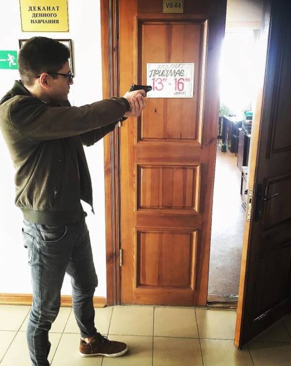 Ранее он публиковал фото, на которых он запечатлен с пистолетом. Например, 10 октября он выложил фотографию под одним из деканатов как раз ХНУ им. Каразина.