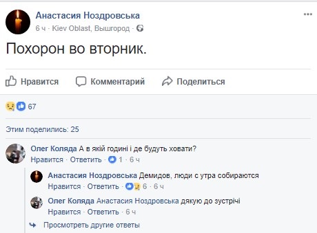 В комментариях к сообщению она уточнила, что прощание с матерью состоится утром в селе Демидов под Киевом. При этом точного времени Анастасия не назвала.