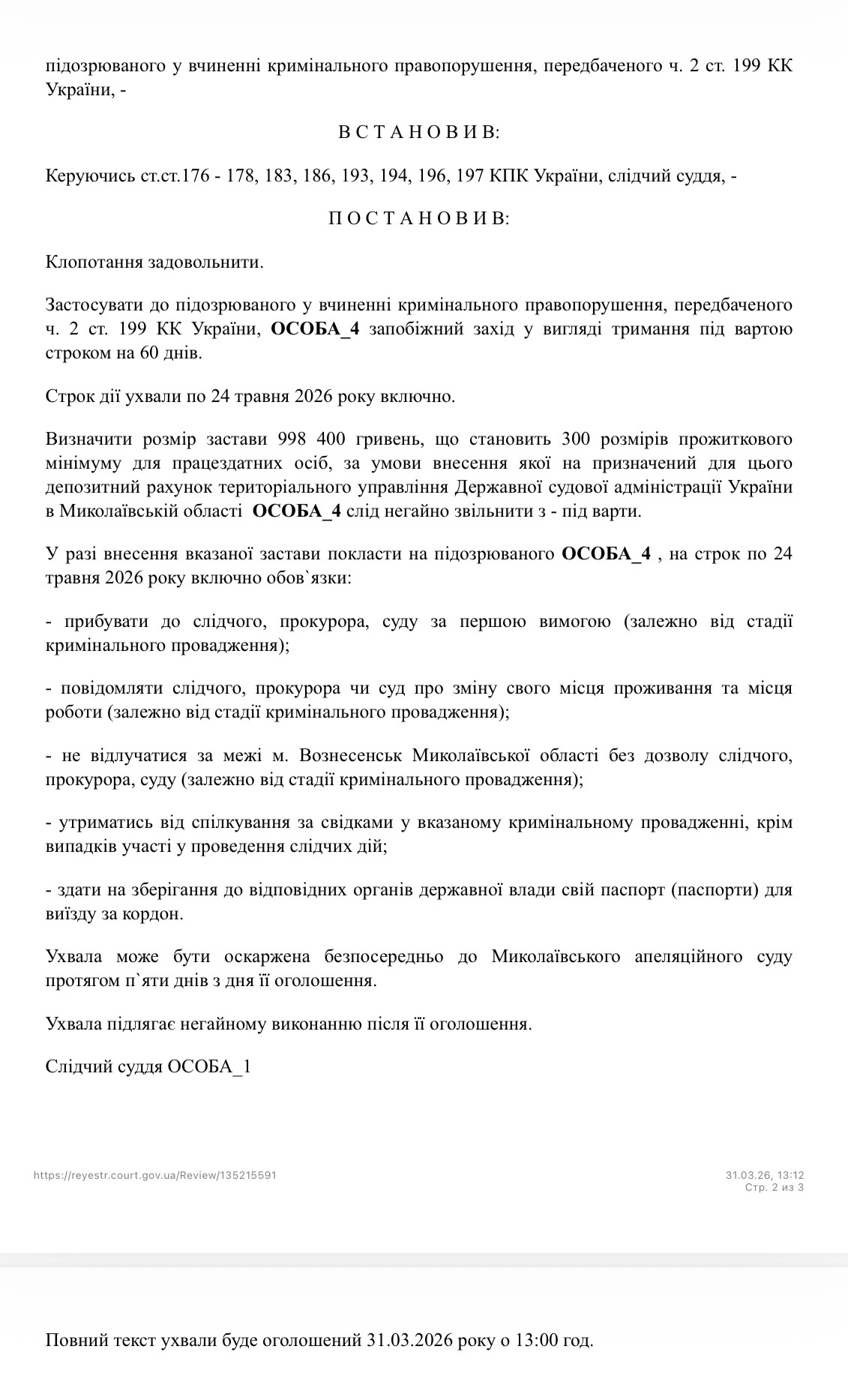 Чоловіку обрано запобіжний захід у вигляді тримання під вартою із можливістю виходу під заставу у розмірі 998 400 гривень.