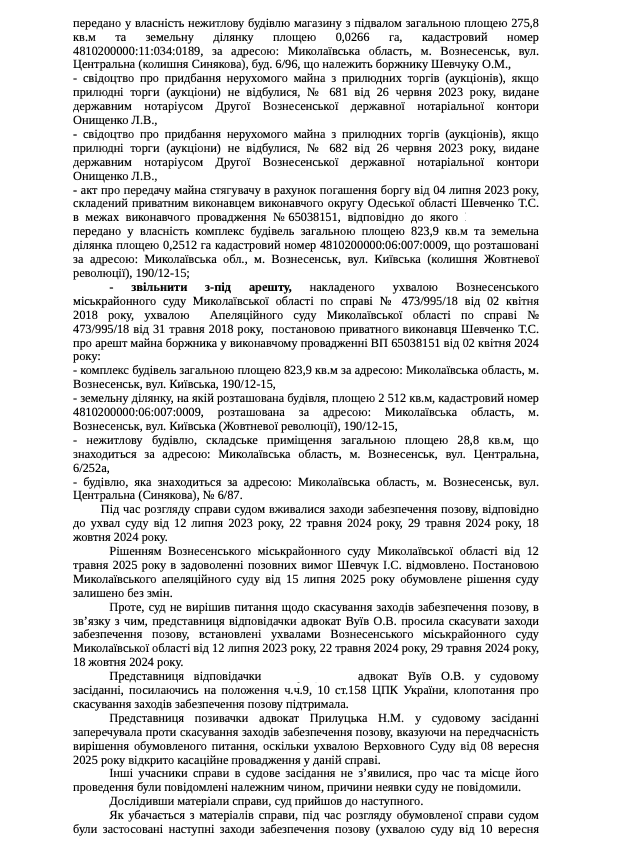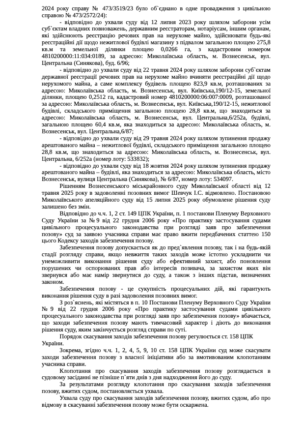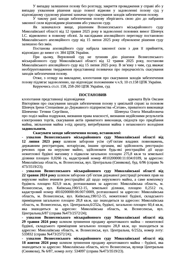 І хоча рішення у справі було винесене ще в травні 2025 року – суд відмовив в задоволенні позову Ірени повністю – але з невідомих причин суд не відмінив свою ухвалу про зупинення торгів і заборону переоформлення майна. Більш того, розглядаючи апеляційну скаргу Шевчук Ірени, апеляційний суд також не відмінив заходи забезпечення влітку 2025року.
