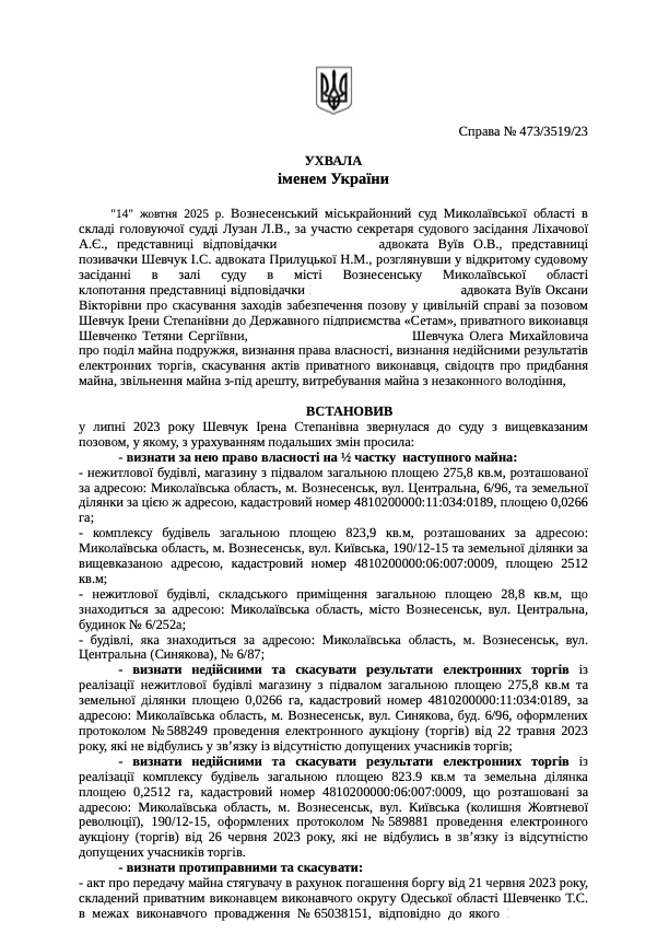 Вознесенський міськрайонним суд Миколаївської області своєю ухвалою від 15 жовтня цього року скасував заходи забезпечення позову Шевчук Ірени до свого чоловіка Шевчука Олега про поділ майна подружжя і про скасування результатів торгів з продажу цього майна. Суд ще також поновив можливість здійснювати реєстраційні дії з майном Шевчука Олега, яке було передано кредитору за його борги.