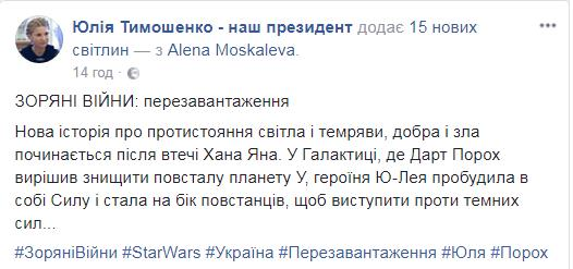 На странице поклонников Юлии Тимошенко в Facebook появился комикс по мотивам культовой космической франшизы Star Wars. На 15 картинках рассказывается политическая история борьбы Ю-Леи с Дарт Порохом.