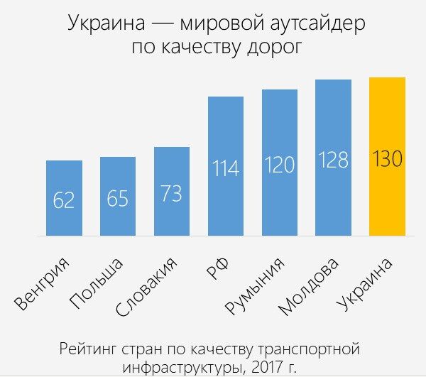И даже имеющиеся в стране дороги находятся в плохом состоянии, так, в рейтингах качества автодорог Украина занимает стабильно низкие позиции.
