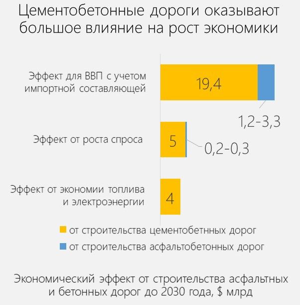 "Положительный эффект от бетонных дорог для экономики разнообразен: снижается импорт битума, растет спрос на отечественный цемент, падает потребление топлива, снижаются затраты на освещение дорог из-за лучшей отражательной способности бетона. Цементная дорога более устойчива к износу, не деформируется при жаркой погоде и под воздействием тяжелого транспорта, соответственно, на дороге не возникает колеи", - говорится в статье.