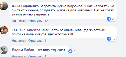 "Запретить нужно подобное. У нас не хотят и не считают нужным, создавать условия для животных. Раз не хотят, значит нужно запретить", "Ужас, есть Аскания-Нова, где животные почти на воле живут, здесь - тюрьма!", "Гестапо отдыхает", - прокомментировали они.