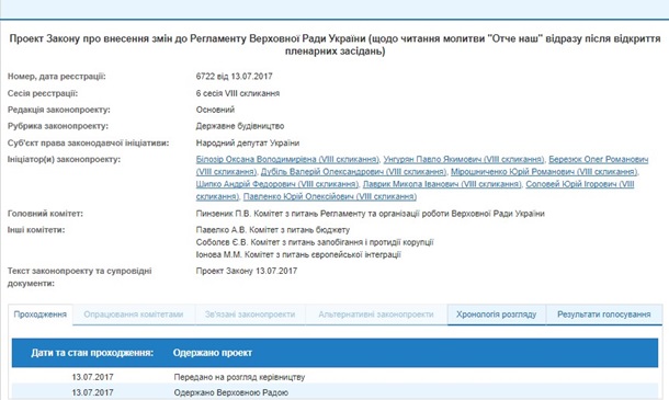 Ряд народных депутатов внесли в парламент законопроект № 6722, в котором предлагают читать молитву "Отче наш" сразу после открытия пленарных заседаний.