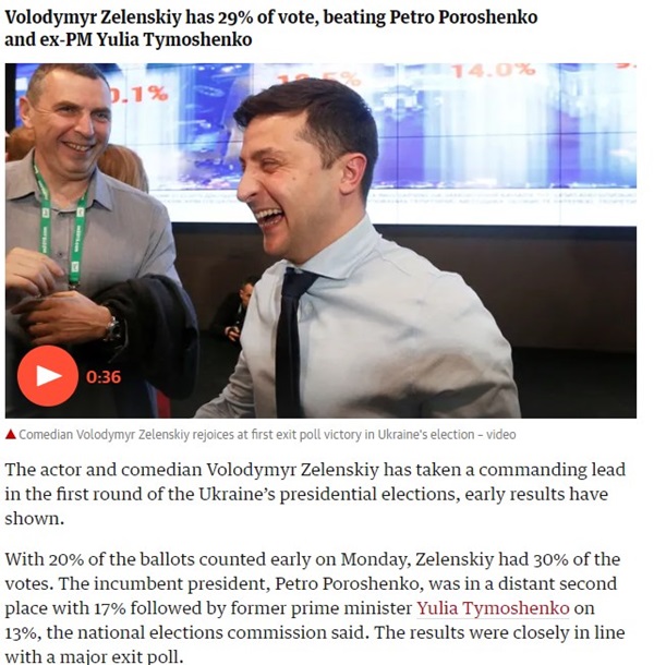 Так, британская The Guardian говоря о победе Владимира Зеленского в первом туре, написала, что многие украинцы опасаются, что отсутствие опыта у Зеленского поставит под угрозу страну, которая столкнется с войной против поддерживаемых Россией сепаратистов на юго-востоке.