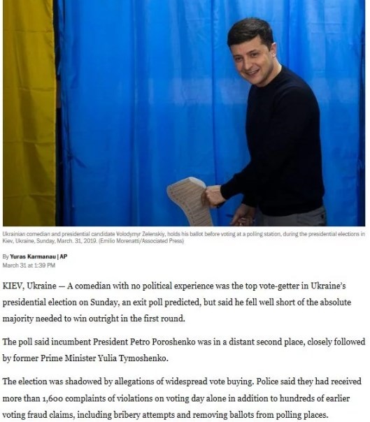 "Выборы были омрачены утверждениями о широкомасштабной скупке голосов. Полиция заявила, что только за один день голосования она получила более 1600 жалоб на нарушения в дополнение к сотням ранее поданных заявлений о мошенничестве, включая попытки взяточничества и вынос избирательных бюллетеней с избирательных участков. Как и популярный киноперсонаж, которого он играет, Зеленский сделал коррупцию главной темой своей кампании. Он предложил пожизненный запрет на занятие государственных должностей для всех, кто осужден за взяточничество. Он также призвал к прямым переговорам с Россией о прекращении конфликта на востоке Украины", - пишет издание.
