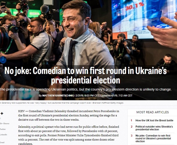 "Бизнесмен-миллиардер Порошенко, избранный после Евромайдана в 2014 году, изо всех сил пытался положить конец войне в стране с поддерживаемыми Россией сепаратистами на востоке Украины и выполнить обещанные реформы, которые привели его к власти. Несмотря на то, что в последние недели Порошенко набрал обороты, народное недовольство его руководством глубоко укоренилось в массах. Это разочарование и открыло двери для Зеленского, чья единственная заслуга в украинской политике - сыграть президента в телесериале под названием Слуга народа, популярной сатире об учителе, который занял высшую должность в стране", - сообщает Politico.
